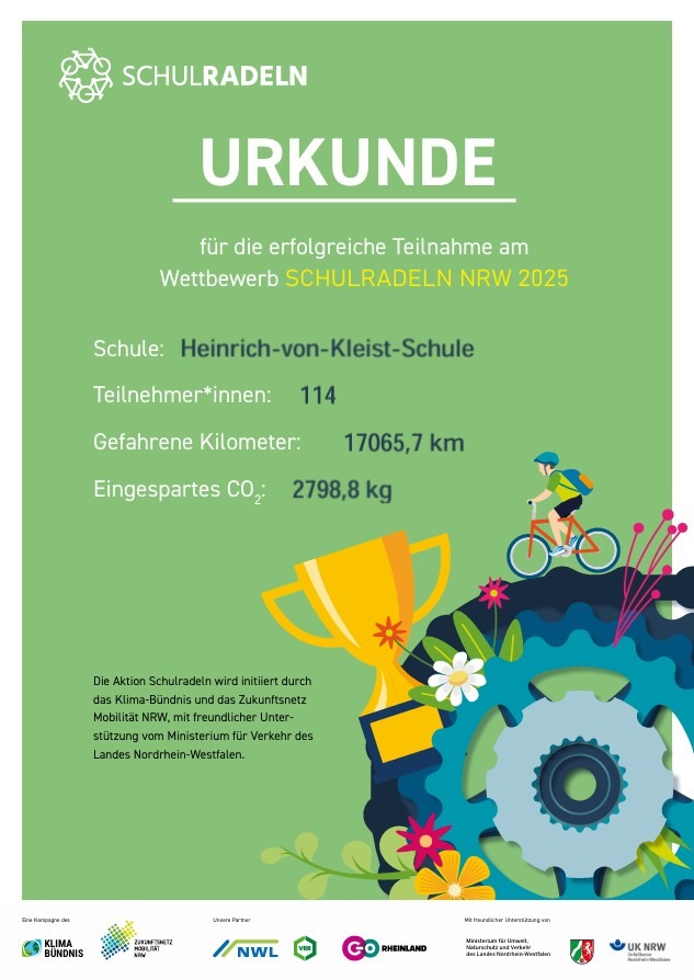 am Schulradeln NRW 2025 haben sich beeindruckend viele Menschen beteiligt. Ihr seid Teil von 102.997 Schüler*innen, Eltern und Lehrkräften an 1.785 Schulen! Dank euch wurde der Wettbewerb zu einem vollen Erfolg. Eure Teilnahme hat auch einen bedeutenden Beitrag zum Klimaschutz geleistet: Jeder zurückgelegte Kilometer mit dem Fahrrad hat zur Reduzierung von CO2-Emissionen beigetragen. Im Namen des Ministeriums für Umwelt, Naturschutz und Verkehr möchten wir euch dafür unseren herzlichen Dank aussprechen.